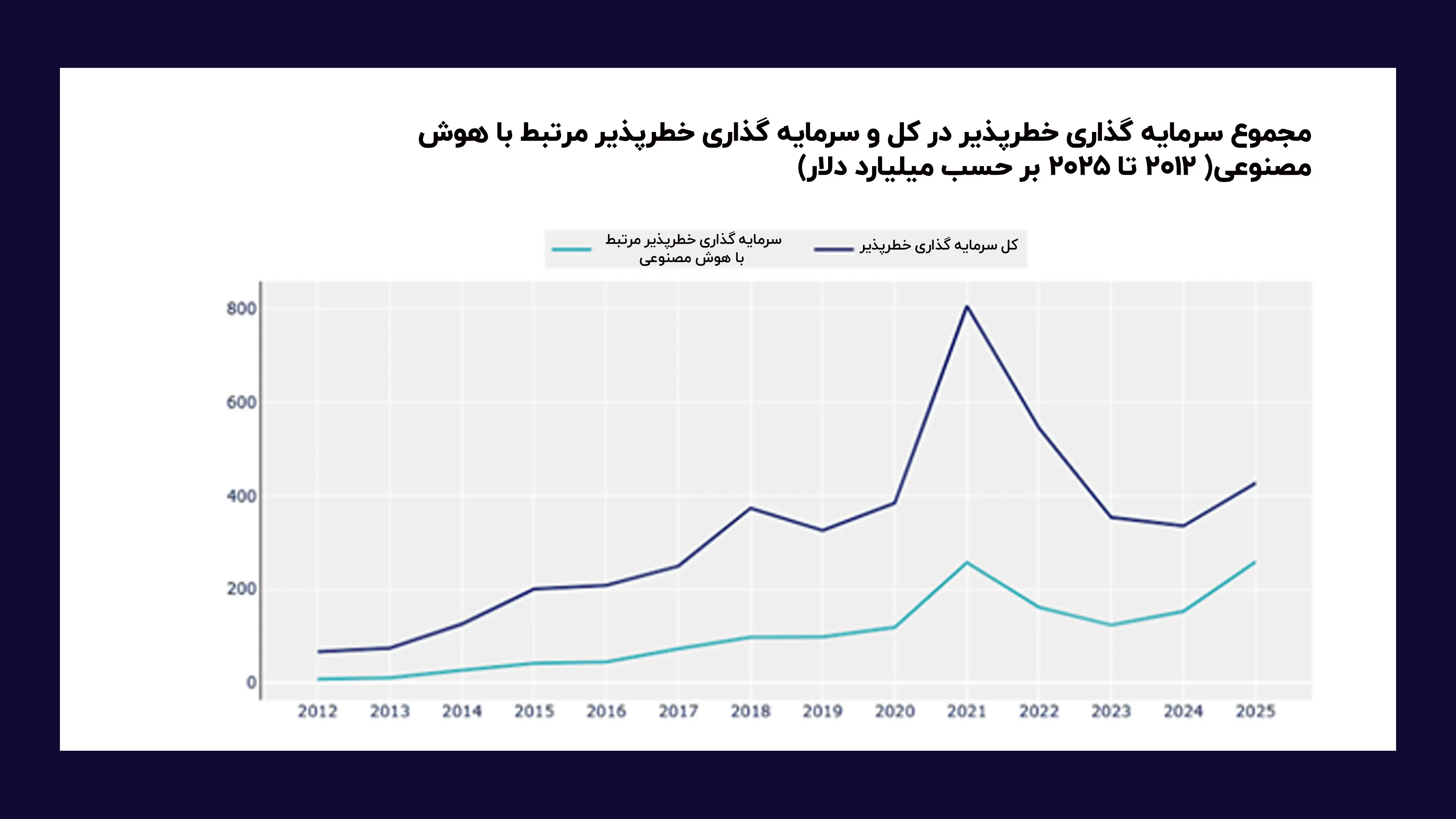 طبق گزارش OECD، سرمایه گذاری خطرپذیر در شرکت های هوش مصنوعی طی یک دهه رشد کم سابقه ای داشته و ارزش سالانه آن از 8.3 میلیارد دلار در سال 2012 به 258.7 میلیارد دلار در سال 2025 رسیده است. در سال 2025، هوش مصنوعی به تنهایی 61 درصد از کل ارزش سرمایه گذاری خطرپذیر جهان را جذب کرده است. این در حالی است که سهم آن در سال 2022 حدود 30 درصد بود و طی سه سال تقریبا دو برابر شده است.
