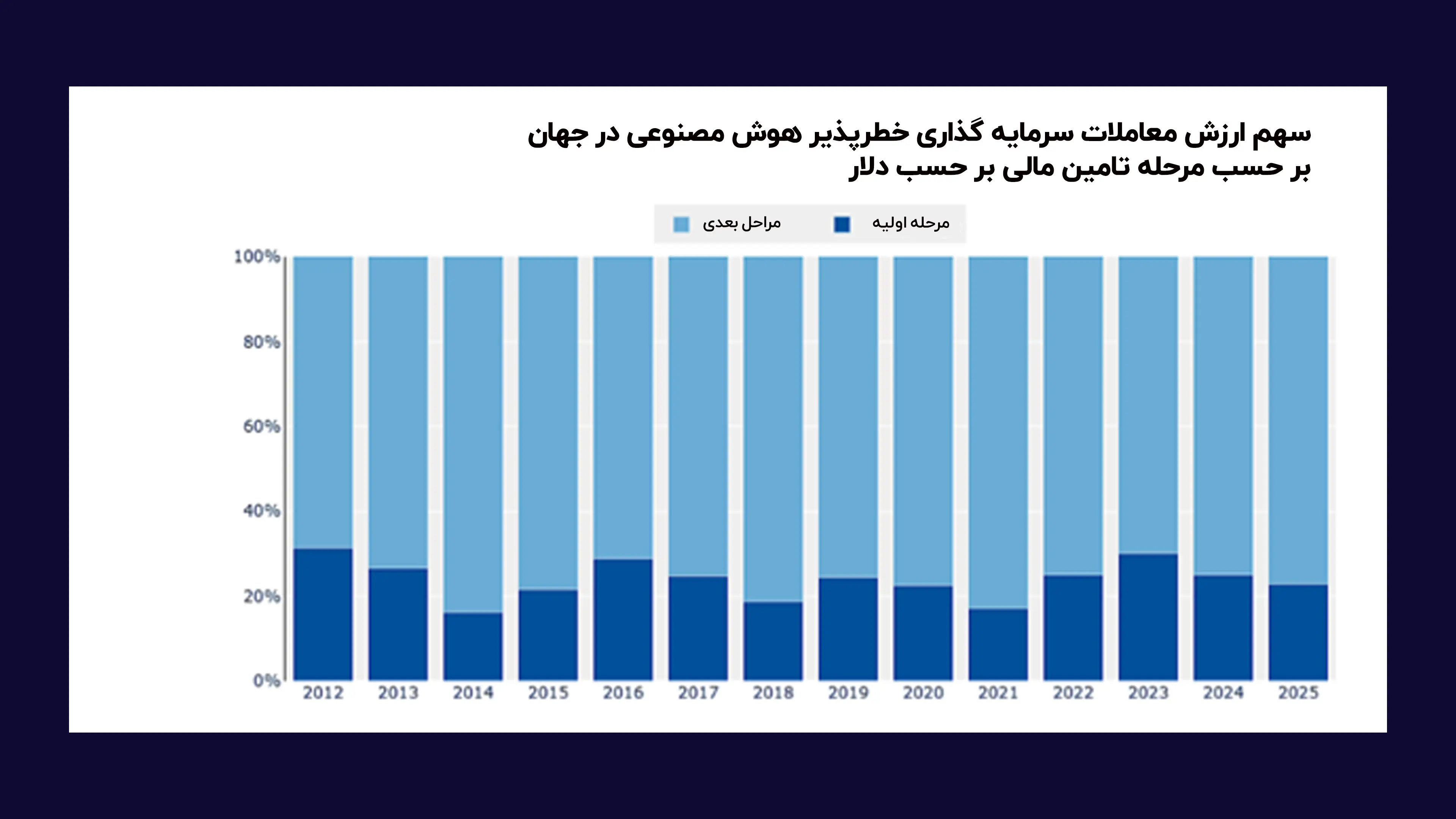 البته سهم مرحله اولیه در سال 2021 به پایین ترین سطح رسید که احتمالا به فضای نامطمئن دوران کرونا و تمایل سرمایه گذاران به شرکت های جاافتاده تر مربوط بود. با این حال، سهم مرحله اولیه از نظر تعداد معاملات در پنج سال اخیر رشد کرده و در سال 2025 به رکوردی بالاتر از 75 درصد رسیده است.
