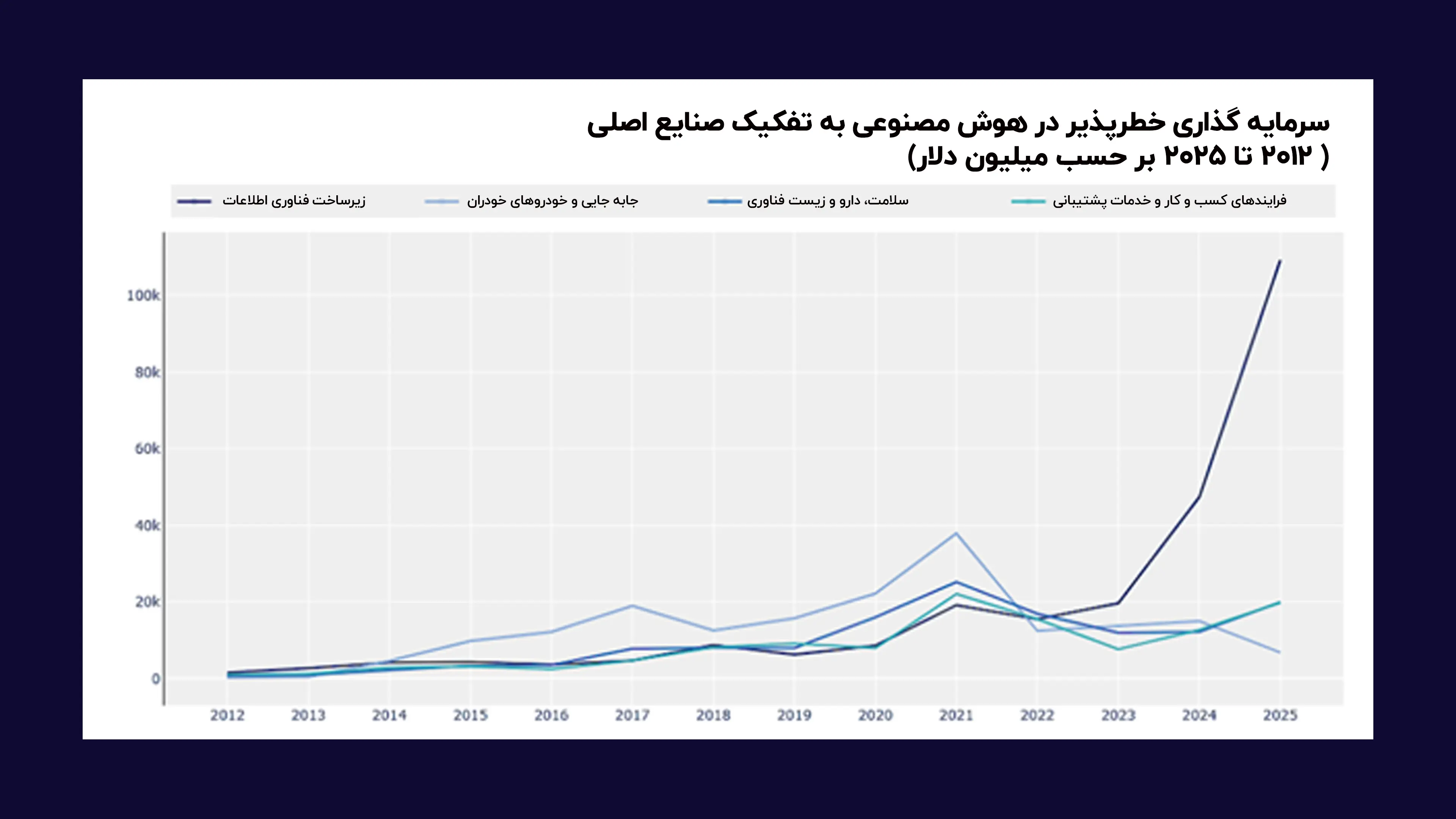 اما از 2023 به بعد، تمرکز اصلی سرمایه ها به سمت زیرساخت و میزبانی فناوری اطلاعات رفته است. سرمایه گذاری این بخش از 47.4 میلیارد دلار در 2024 به 109.3 میلیارد دلار در 2025 رسید و بیش از 42 درصد کل VC هوش مصنوعی در 2025 را تشکیل داد. این حوزه در مجموع بین 2012 تا 2025 حدود 256.1 میلیارد دلار جذب کرده و هم سرمایه گذاری روی زیرساخت محاسباتی و هم سرمایه گذاری مستقیم روی توسعه دهندگان مدل مانند Anthropic، Mistral و X.AI را در بر می گیرد.