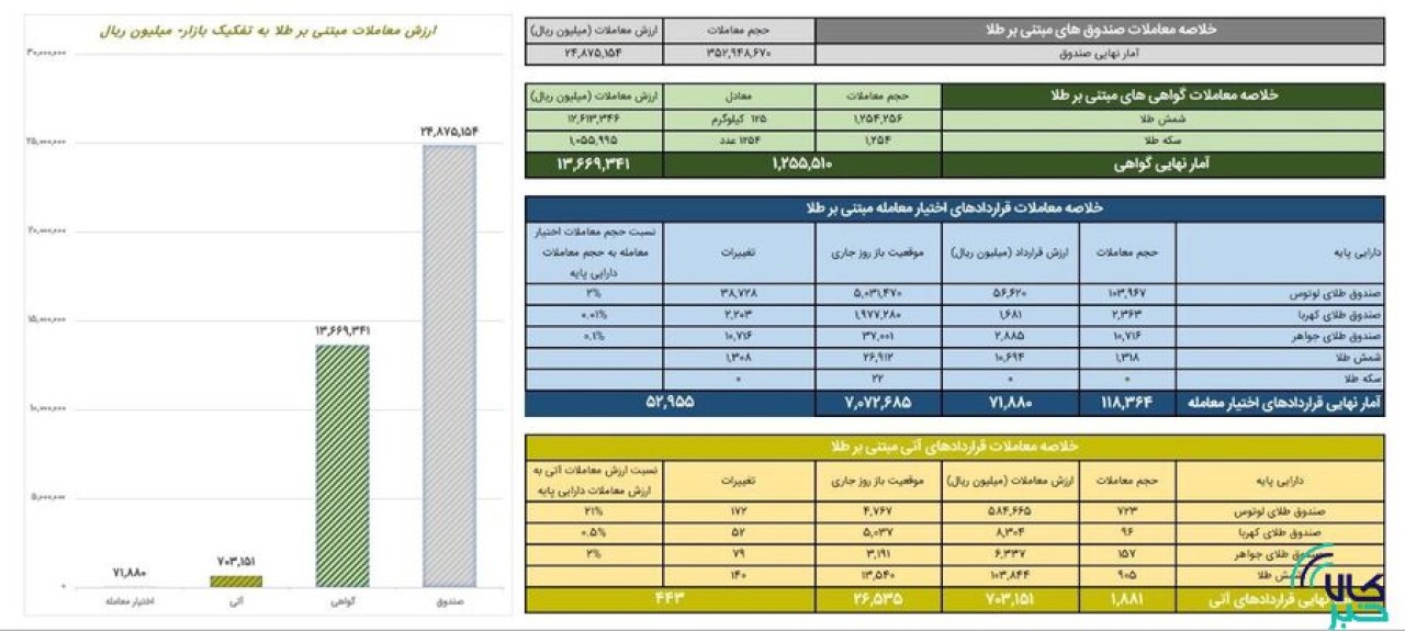 همچنین هزار و 881 قرارداد آتی مبتنی بر طلا به ارزش 70 میلیارد تومان مورد معامله قرار گرفت. در قراردادهای آتی شاهد افزایش 443 موقعیت در مجموع موقعیت های باز قراردادهای مبتنی بر طلا بودیم.