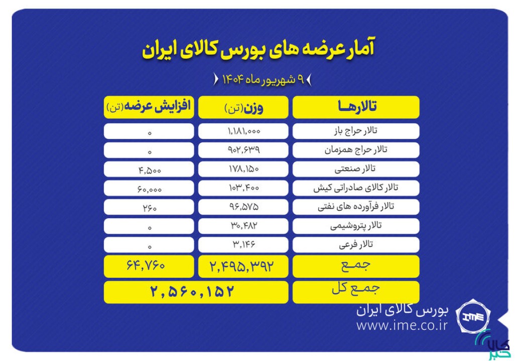 تالارهای بورس کالای ایران روز یکشنبه ۹ شهریور ماه میزبان عرضه ۲ میلیون و ۵۶۰ هزار و ۱۵۲ تن انواع محصول است و به ترتیب تالار حراج باز و تالار حراج همزمان بیشترین میزان عرضه ها را به خود اختصاص داده اند.