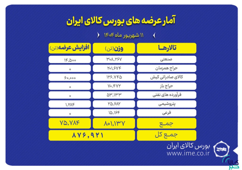 تالار صادراتی هم عرضه 186 هزار و 745 تن محصول شامل 100 هزار تن فولاد، 30 هزار تن آهن اسفنجی، 29 هزار و 695 قیر، 20 هزار تن سیمان، 7 هزار تن گوگرد و 50 تن عایق رطوبتی را تجریه می کند.