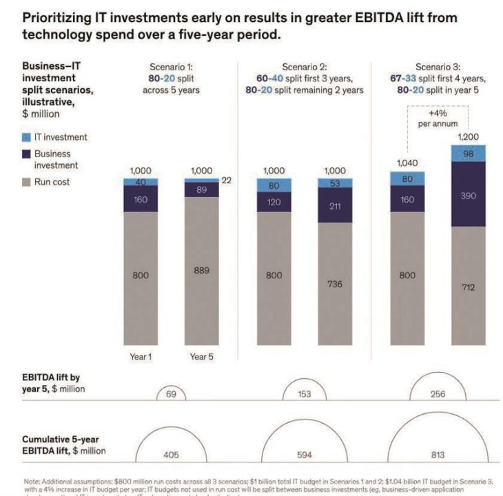 این رویکرد متعادل در سرمایهگذاری بهخوبی در شکل شماره 1 نشان داده شده است. این نمودار، که سناریوهای مختلف تخصیص بودجه فناوری اطلاعات را مدلسازی میکند، نشان میدهد که چگونه شرکتها میتوانند با تغییر ترکیب سرمایهگذاری خود از نگهداری سیستمهای قدیمی (بخش خاکستری) به سمت سرمایهگذاریهای تحولآفرین (بخش آبی تیره) و رشد کسبوکار (بخش آبی روشن)، ارزش و بازدهی بسیار بیشتری را آزاد کنند. همانطور که نمودار نشان میدهد، سناریوی سوم با سرمایهگذاری بیشتر در تحول، بیشترین پتانسیل بازگشت سرمایه را ایجاد میکند.